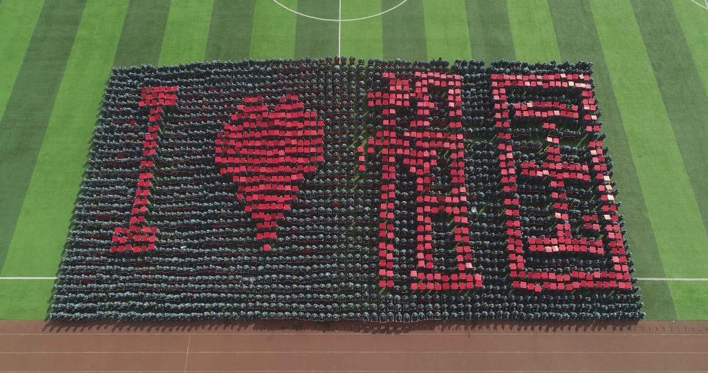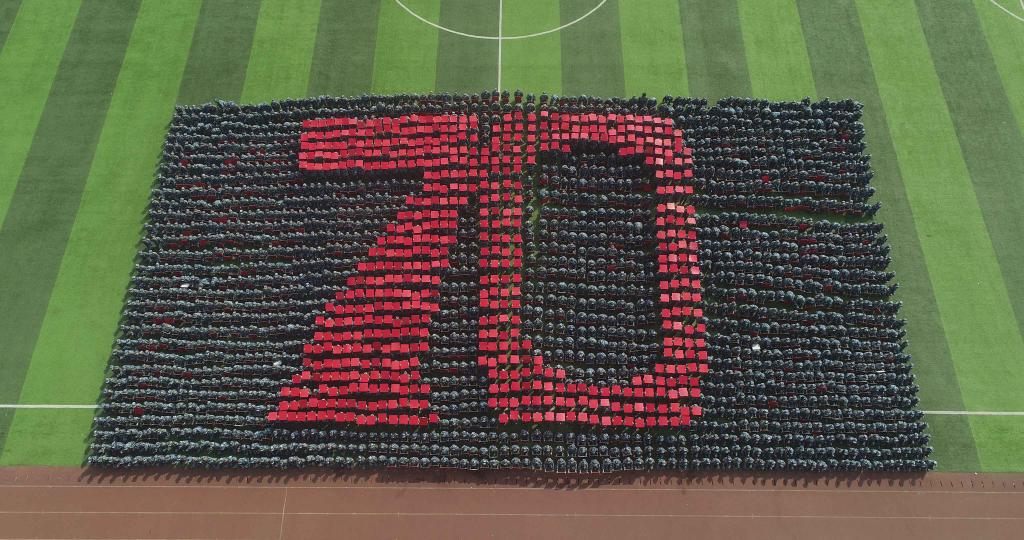 在振奋激昂的军乐声中,由辅导员组成的参训方队及新生军训方队依次走过主席台,接受检阅。他们口号响亮、步伐坚定,意气风发、气宇轩昂,展现了师院青年朝气蓬勃、奋发有为的精神风貌。养成方队、战术演练、匕首操、军体拳、手语操等课目表演气势恢宏、震撼全场,赢得了阵阵掌声。伴随响亮的口号,2019级新生用“师院你好”“我爱师院”等暖心话语表达对母校的深情厚谊;用“我爱祖国”“1949”“2019”“70”等醒目字样抒发对祖国的赞颂之情。全校师生齐声合唱《歌唱祖国》,共同向祖国母亲70周年华诞献礼。