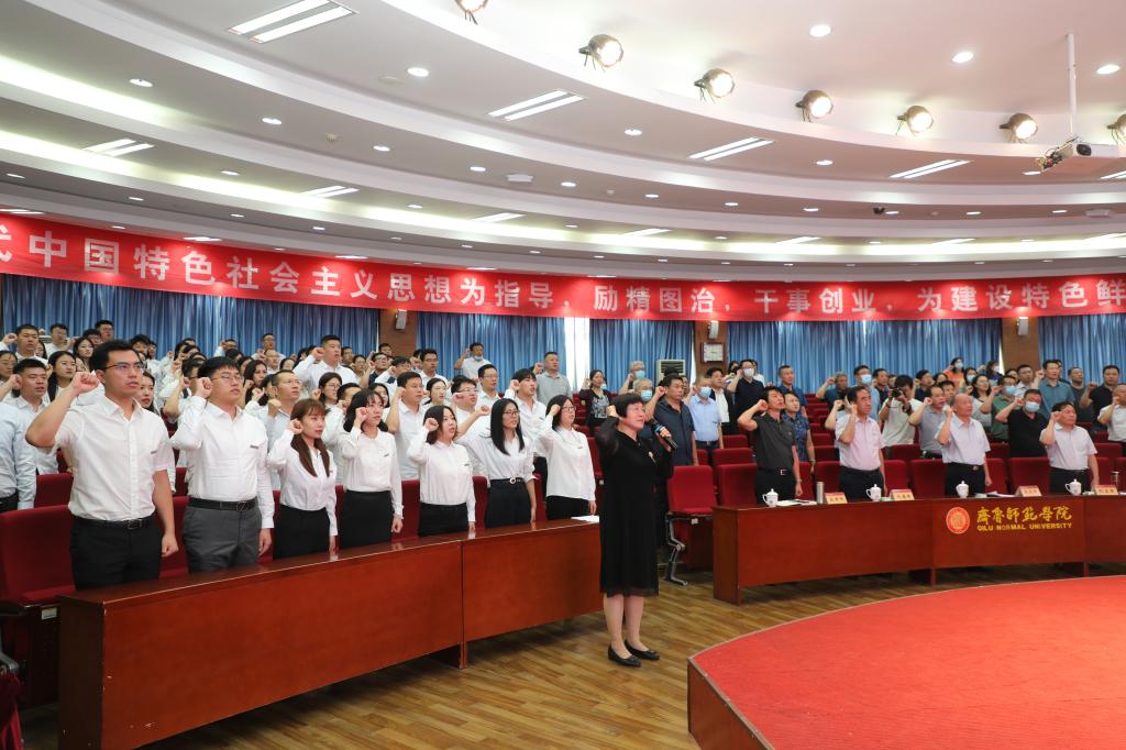 在山东省优秀教师、山东省高校教学名师、山东省师德标兵,“富民兴鲁”劳动奖章和“巾帼建功”标兵等荣誉称号获得者、二级教授陈海燕领誓下,与会教师集体宣誓。