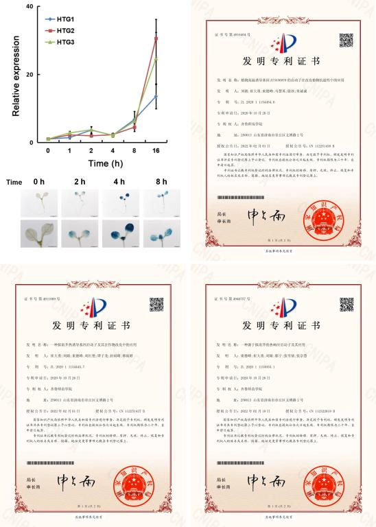 随着温室效应的增加,全球气候变暖已造成包括植物开花时间在内的生物学进程发生改变,导致物种的灭绝。同时,气候变暖还会增加极端高温的发生强度和频率,严重影响到作物的产量。因此,在全球气候变暖正成为人类所面临的一个重大环境和科学问题的背景下,在植物中发掘高温应答基因,并解析其响应高温的分子机理,不仅具有重要的生物学意义,还能对优质、高产、抗逆农作物品种的培育提供理论依据和新的基因资源。生物质品种改良研究团队以模式植物拟南芥为实验材料,利用RNAseq技术筛选出三个受高温诱导的基因HTG1、HTG2和HTG3,通过实时定量PCR和启动子融合报告基因GUS分析等实验方法进一步证明这三个基因的表达的确受到高温高效诱导。目前,团队正在积极解析它们在提高植物高温耐受性中的分子机理及信号通路。这些研究成果除了孵育出此次的三项国家发明专利外,谭子龙博士还在2021年以“拟南芥HTG1基因通过抑制细胞死亡提高植物耐热性的机制研究”为题成功申报一项国家自然科学基金项目(32100247)和一项山东省自然科学基金项目(ZR202103010625),并与刘婧博士共同指导学生在第五届全国大学生生命科学竞赛中荣获二等奖(CULSC2021KE0124,白露等)。