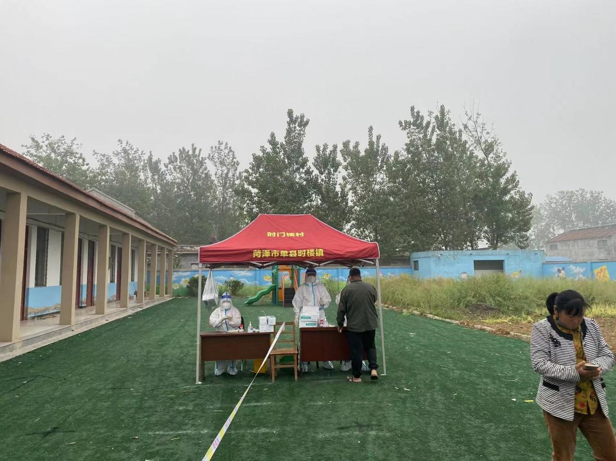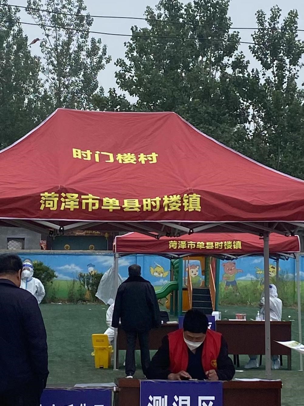 时门楼村位于菏泽市单县时楼镇东北5公里,地处平原地区,日照时间较长,日常的村民核酸检测工作在村办幼儿园操场进行。随着气温的升高,四月底太阳的直射体感温度就可以达到30℃,防疫工作人员身着密不透风的防护服,工作起来更是炎热难耐。早年村内有专用帐篷,但是已经损坏无法使用,目前工作人员只能在烈日下为村民进行核酸检测工作,工作一天更是汗流浃背。