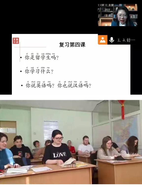 本次教学由文学与历史文化学院的王天舒老师担任主讲教师,在线上课堂教学中,师生互动积极、交流顺畅。王天舒老师带领俄方学生识汉字认生词,以游戏启发兴趣,以文化拓展理解。她在总结教学评价时谈到:“俄罗斯学生学习热情高,回答问题积极,课堂中俄方老师配合默契,相互协助,教学任务圆满成功。”此次对俄汉语教学工作是对金年会官网教师教学能力的一次新挑战,国际教学经历也有利于教师以交流促成长、以交流促教学、以交流促应用、以交流促创新。