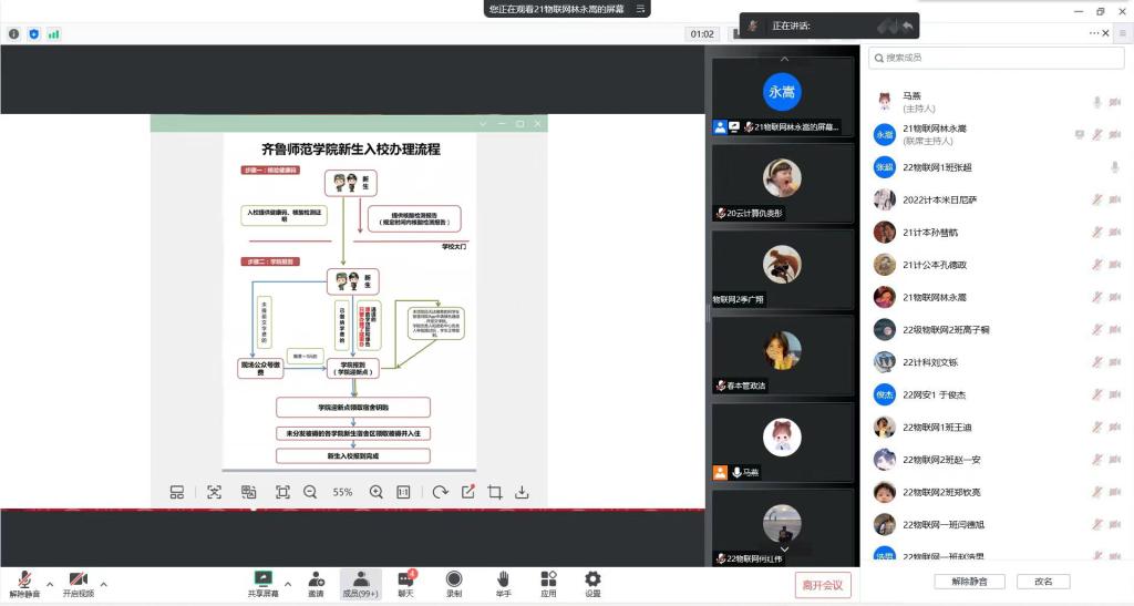 会议伊始,梁晨首先对2022级新生到来表示热烈欢迎,鼓励同学们在大学里树立远大理想、热爱伟大祖国、担当时代责任、勇于砥砺奋斗、练就过硬本领、锤炼品德修为,不负青春,不负韶华。随后,梁晨详细讲解了新生入校报到流程,重点强调入校报到的疫情防控要求,部署全面摸排新生返程信息工作,引导学生如实上报个人旅居史、健康史,“人盯人”建立报到台账。提醒学生做好返校准备,注意出行安全谨防诈骗陷阱。马燕带领新生认真学习 《2022级新生入学须知》,为同学们解答了自主选宿、新生缴费操作、智慧团建、团员转接流程等学生关心的问题。会后同学们满怀对大学生活的憧憬,纷纷在公屏弹幕上提出自己的问题,老师们就问题一一进行详细解答。