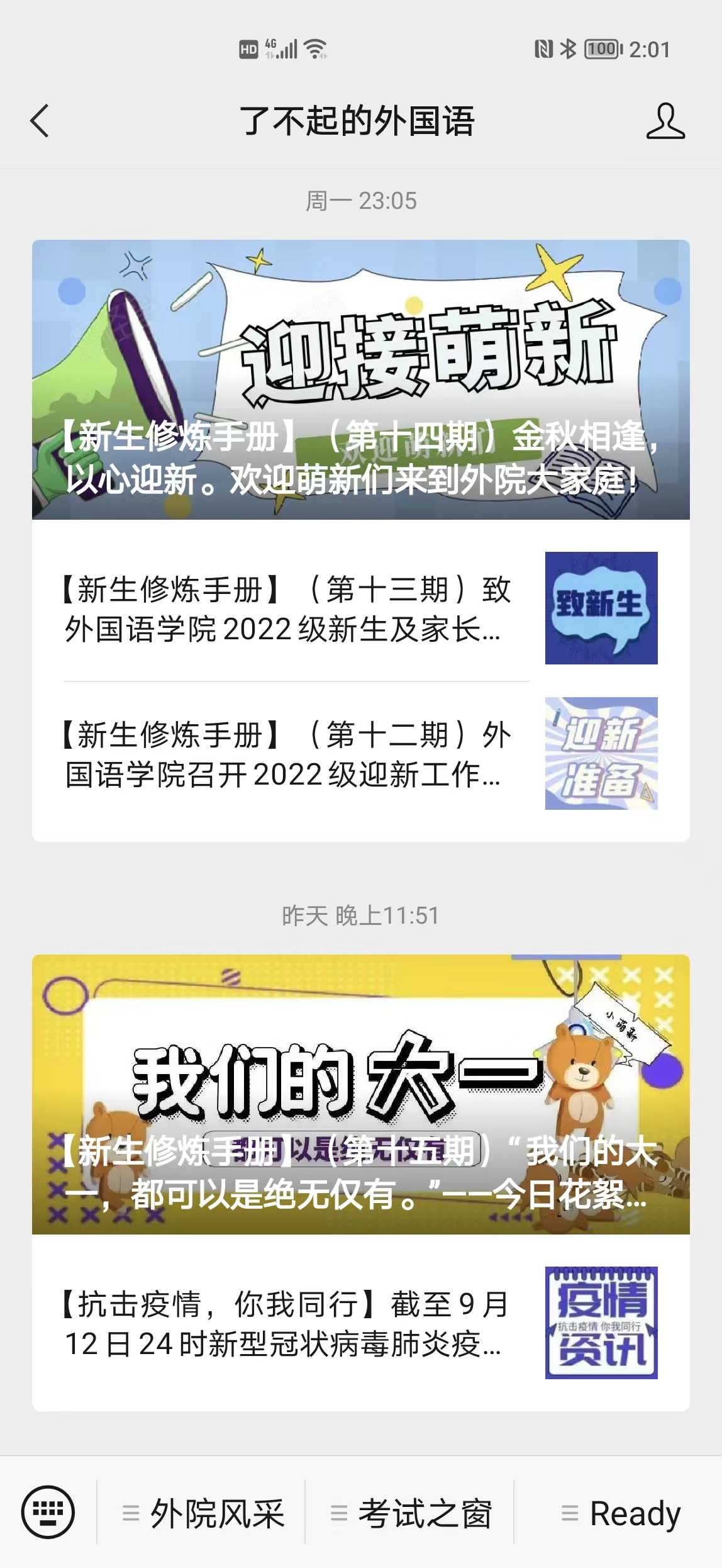 网络迎新、拓展渠道,筑牢思想引领阵地。为帮助新生尽快转变身份、了解学校和学院情况,在获取录取名单的第一时间,学院由专人主动与每一位录取学生取得联系,建立了新生QQ群和微信群。在群内,学院安排辅导员和高年级优秀学生入群为新生答疑解惑。与此同时,学院依托官方公众号“了不起的外国语”开辟了“新生修炼手册”专栏和官方抖音号的新生“show”专栏,从8月初起持续推送迎新专题,内容涵盖了校院介绍、师生风采、团学简介等。学院还于开开学前召开了全体新生线上班会和学生家长会,利用新媒体优势,发挥网络育人的主阵地、主平台、主渠道作用,做好家校联合工作,使新生将适应阶段前移,实现从高中生活到大学生活的无缝衔接和完美角色转换。