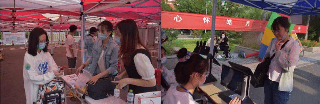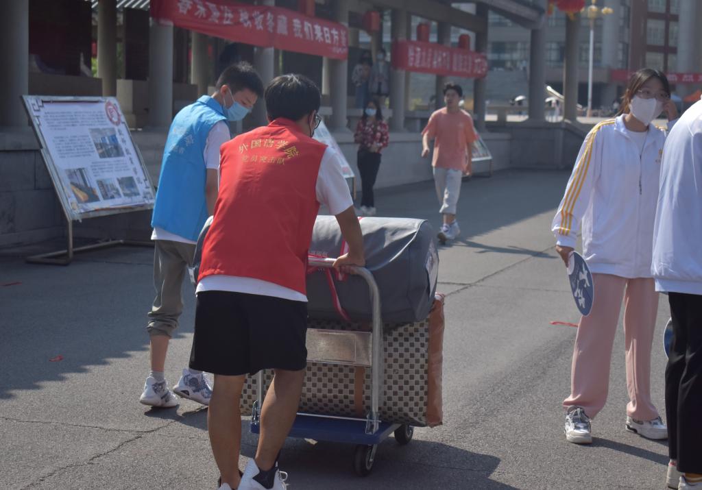 全员参与,热情服务,彰显学院人文关怀。9月13号,迎新工作迎来高峰,学院党政负责人与全体辅导员参加迎新工作,在迎新现场与学生交流解答疑惑,并对细节之处做了进一步强调和调整,鼓励志愿者要继续努力、真诚服务,做好各方面的迎新接待工作。与此同时,学院团总支指导学生会学生干部、迎新志愿者等学生团体分别组建了迎接组、服务组、后勤组、媒体组4个迎新小组,协力共同做好迎新工作。由于疫情影响,今年新生家长不能进入校园,搬运行李就成为了迎新点的重点工作,为此学院专门购置了4台行李板车用以协助新生行李运输,校园中穿梭着身穿红蓝马甲的志愿者的身影,他们不辞辛苦,手提肩扛、借助小推车等工具护送新生行李到宿舍。其中,学生党员们自发组织了一支学生党员先锋队,也加入到志愿服务中来,在迎新期间帮助新生答疑解惑,协助新生们搬运行李,指导并护送新生报到、熟悉校园环境,彰显学生党员的先锋模范带头作用。受到现场气氛的感染,新生中来自2022级商务英语班的夏凯迪、王宏峰两位男同学到宿舍放下行李后就转身主动要求加入到志愿服务队伍中,成为了志愿服务队中年龄最小的两位成员。