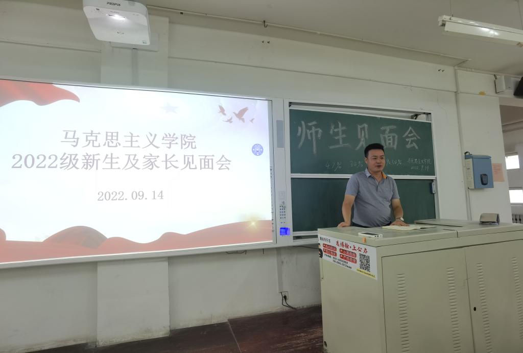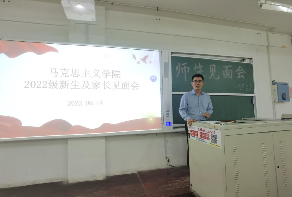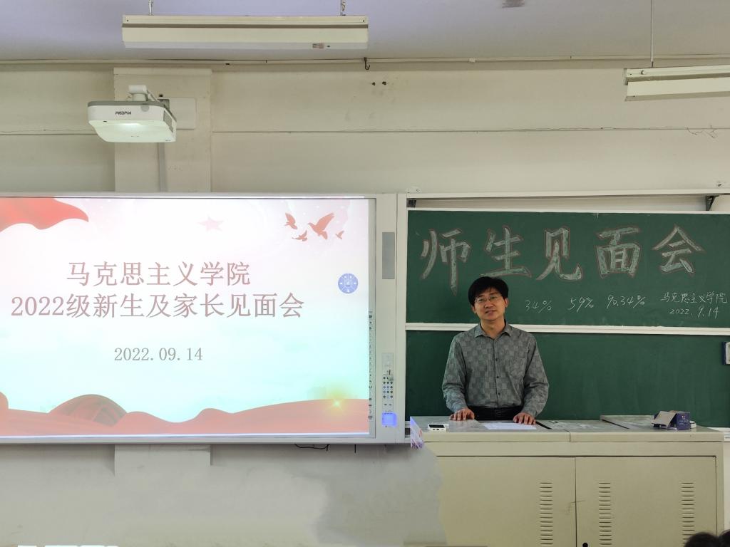 9月14日上午,马克思主义学院在2号教学楼A307教室举办2022级新生及家长见面会。学院党政班子成员、新生辅导员、班主任、教师代表,以及2022级全体新生和家长参加会议。会议采用线上线下结合的形式,新生家长们通过“云端”参加了此次见面会。会议由马克思主义学院党委副书记毛雯主持。