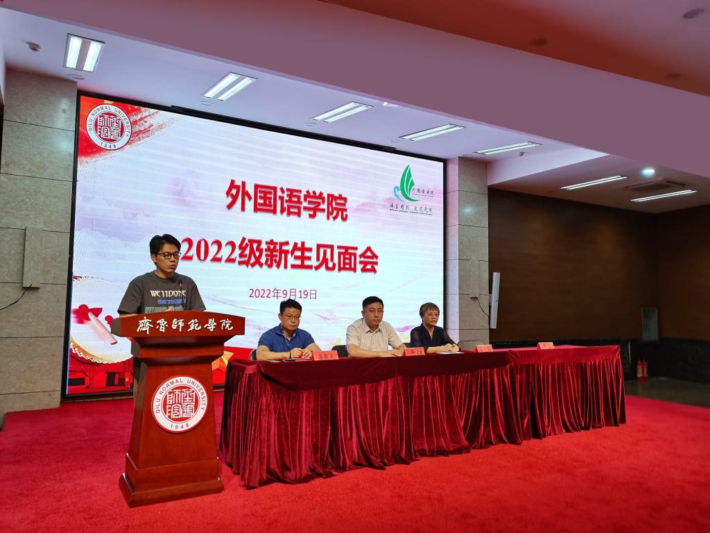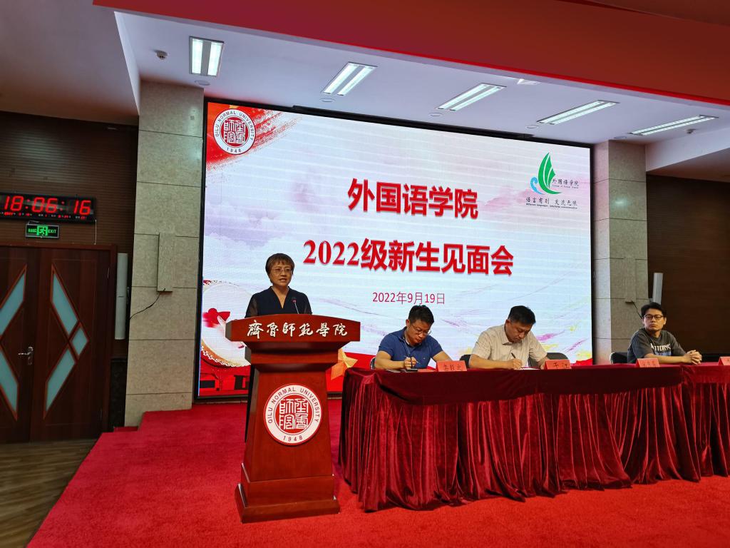 为帮助学院2022级新生更好的了解校园,树立大学奋斗目标,开展好新生入学教育,进一步推动外国语学院学风建设。外国语学院于9月19日晚在章丘校区图书馆学术报告厅召开2022级新生见面会。外国语学院院长宋秀葵、党委书记于江出席会议,团总支书记牛荦、团总支副书记王伟、辅导员倪冉、刘欣欣、邵河,2022级新生班主任以及2022级全体学生参加会议。会议由学院党委副书记栾毅之主持。
