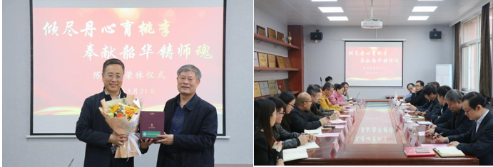 仪式上,李师鹏教授为陈光军同志颁发证书、纪念品,青年教师代表献上鲜花,这不仅承载着尊师重道的精神传承,也承载着师生对荣休教师的依依惜别与万般不舍,同时也增强了全体教师教书育人的责任感和荣誉感。