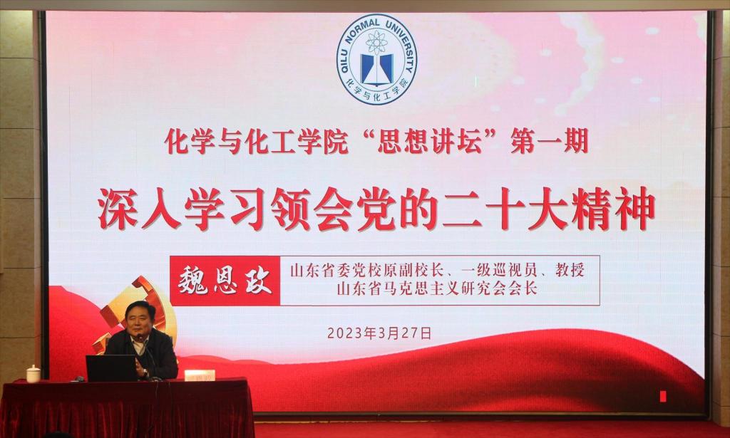为深入学习党的二十大精神,贯彻习近平总书记在全国高校思想政治工作会议上重要讲话精神,不断提高工作能力和水平,3月27日下午,在学校图书馆学术报告厅,化学与化工学院举办第一期“思想讲坛”暨《深入领会党的二十大精神》专家报告会,邀请山东省委党校原副校长、一级巡视员、魏恩政教授做专题报告。化学与化工学院党政领导班子成员、全体行政人员、辅导员和部分学生代表参加本次报告。学院党委书记郭百灵主持。