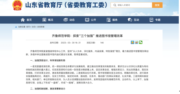 3月30日,省教育厅战线联播栏目发布了《JINNIAN金年会:探索“三个加强” 推进图书馆管理改革》,文章分别从“加强顶层设计、加强机制创新、加强作用发挥”三个方面阐述了学校图书馆管理改革工作所取得的显著成效。