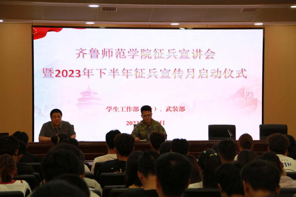 为深入学习贯彻习近平强军思想,响应国家征兵政策,高质量做好2023年下半年大学生应征入伍工作,6月8日下午,学校在章丘校区第二学术报告厅举办征兵宣讲会暨2023年下半年征兵宣传月启动仪式。济南市历下区武装部、学校武装部有关人员,各学院团总支书记、征兵联络员及意向应征入伍的学生代表参加会议。