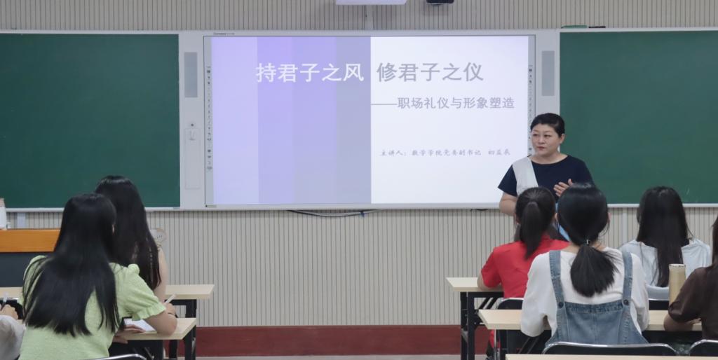 为全面落实立德树人根本任务,聚焦学生职业生涯发展需求,6月15日晚,数学学院君子素养提升计划之职场礼仪与形象塑造专题讲座在1号教学楼B335教室举办。活动由党委副书记初益辰主讲,2023届毕业生现场聆听。