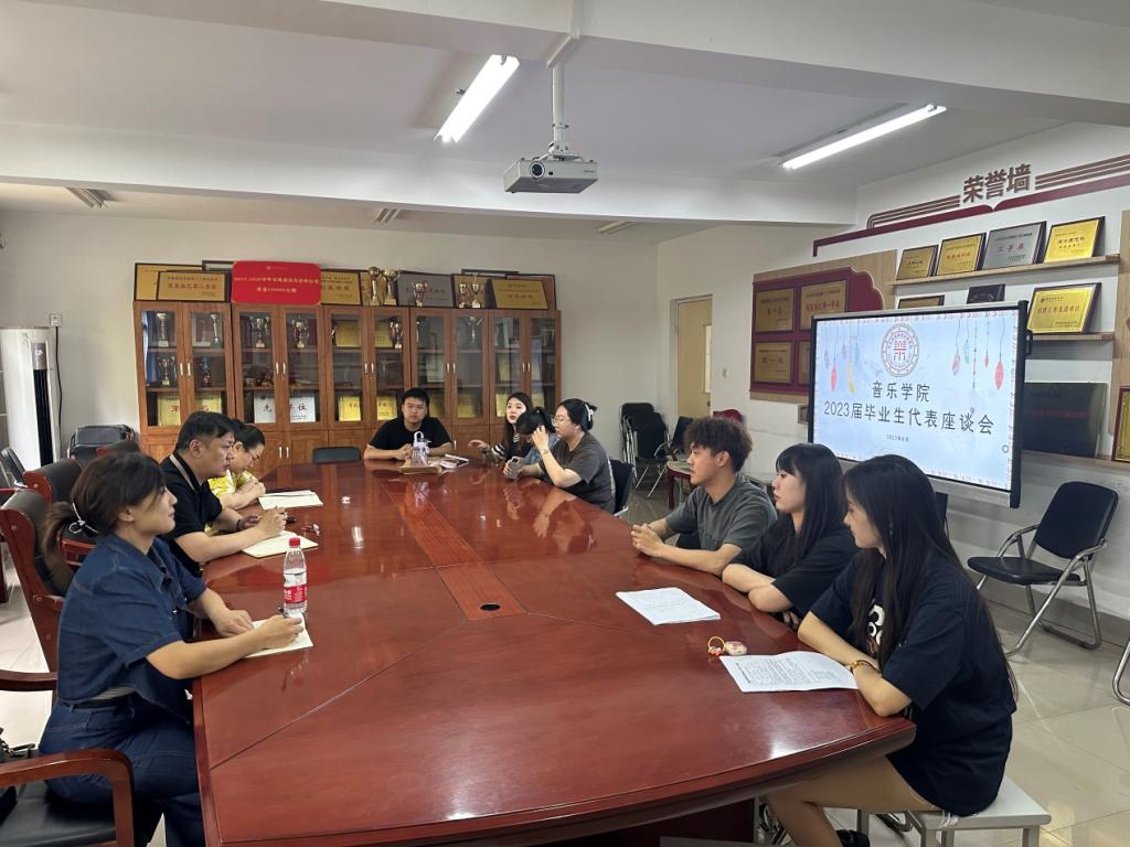 座谈会上,毕业生代表分享了在音乐学院的学习生活感受,畅谈了在校学习生活的所思所想、所行所得、所感所悟,表达了对母校老师的感恩眷念、对同窗好友的祝福不舍、对步入人生新征程的期待向往。同学们还根据自身学习生活情况,对学院的人才培养、教育教学、实习实践、日常管理、后勤保障等方面提出了建议。与会人员认真听取了同学们的发言,给予积极回应,展开深入交流。