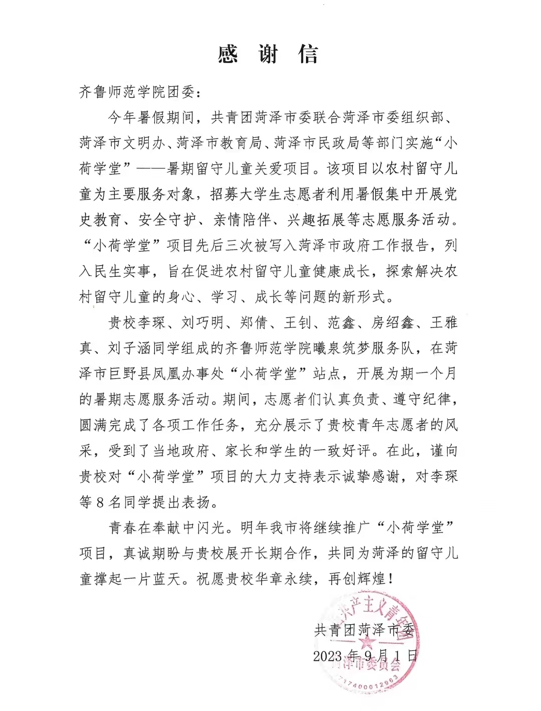 近日,学校收到来自共青团菏泽市委的感谢信,信中表扬学校曦泉筑梦服务队李琛等8名同学在菏泽市巨野县凤凰社区党群服务中心“小荷学堂”做出的积极贡献,并向学校对“小荷学堂”项目的大力支持表示感谢。