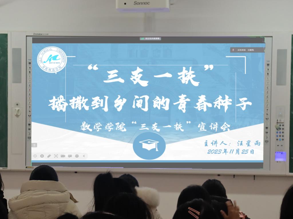 为进一步引导和激发毕业生服务基层、扎根基层的动力和决心,11月25日,数学学院通过线上和线下相结合的方式举办以“三支一扶,播撒到乡间的青春种子”为主题的“三支一扶”宣讲会。学院服务济宁梁山县“三支一扶”志愿者,2023届毕业生汪星雨受邀宣讲,2020级、2021级全体学生参加。