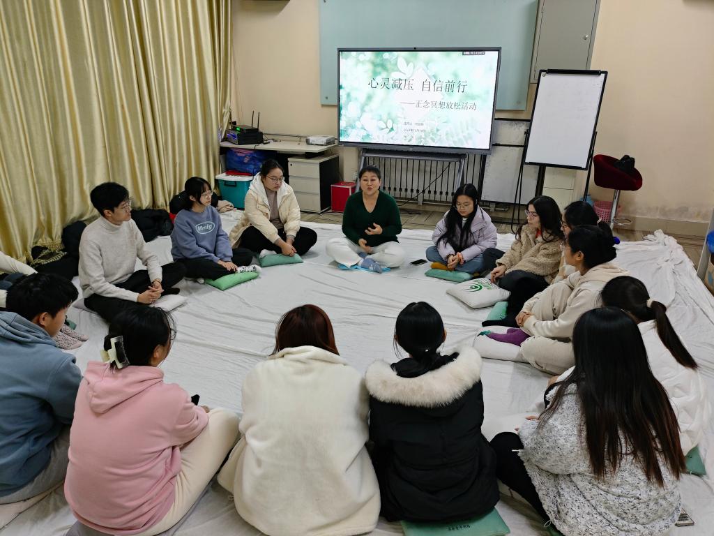 为帮助同学们科学化解考研前焦虑,从容应对考试,12月15日晚,数学学院组织部分毕业生在大学生心理团体活动室开展了“心灵减压 自信前行”正念冥想团体心理辅导活动。