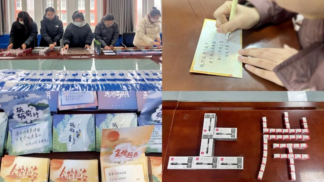 字里行间满是鼓励,点点滴滴尽显关怀。化学与化工学院立足考研学生实际需求,认真挑选、精心准备各类考试用品,招募学生志愿者分装礼包,写下对考研学子的真挚祝福。“考研暖心礼包”包含写有院训“博学笃志化育天工”的专属定制文件袋、手写祝福卡片、考试必备文具,装载着学院对考研学子的沉甸甸的祝福与关心。