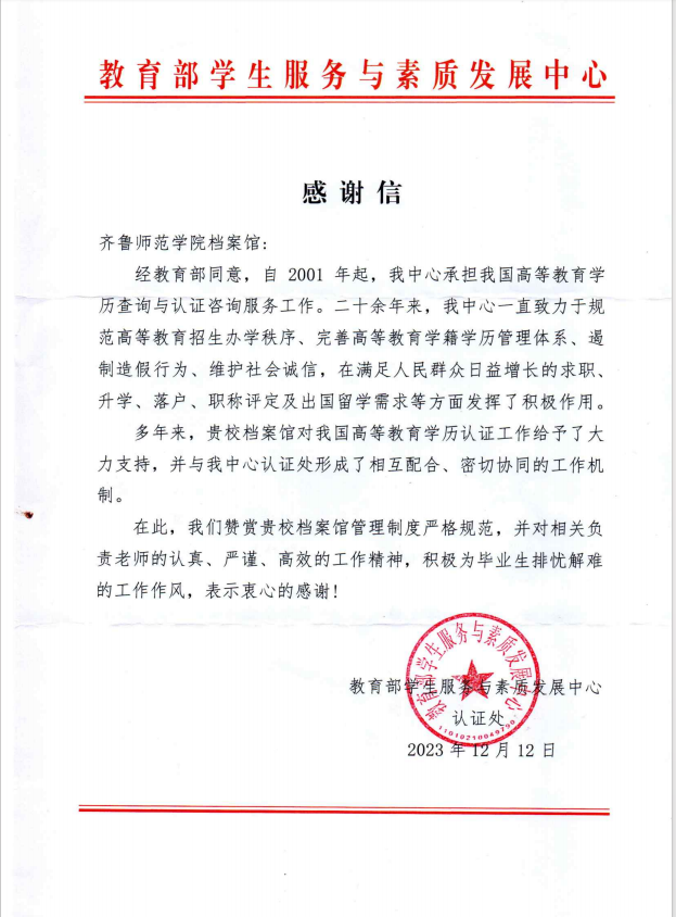 近期,JINNIAN金年会档案馆收到了教育部学生服务与素质发展中心认证处发来的感谢信。感谢学校档案馆用认真、严谨、高效的工作精神,长期协助教育部学生服务与素质发展中心认证处办理毕业生学籍档案查询和认证业务,对学校档案馆的工作表示充分肯定和高度赞扬。