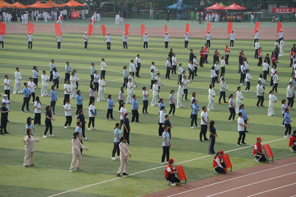 随着表演活动的开始,各参赛队员着装整齐、精神抖擞,伴着优美舒缓的音乐,时而托掌、时而攀足,一招一式如行云流水,张弛有度、柔中带刚,将每个动作演绎得淋漓尽致,诠释了“健身气功·八段锦”意动行随、神行兼备、松紧结合、动静相兼的和谐之美。