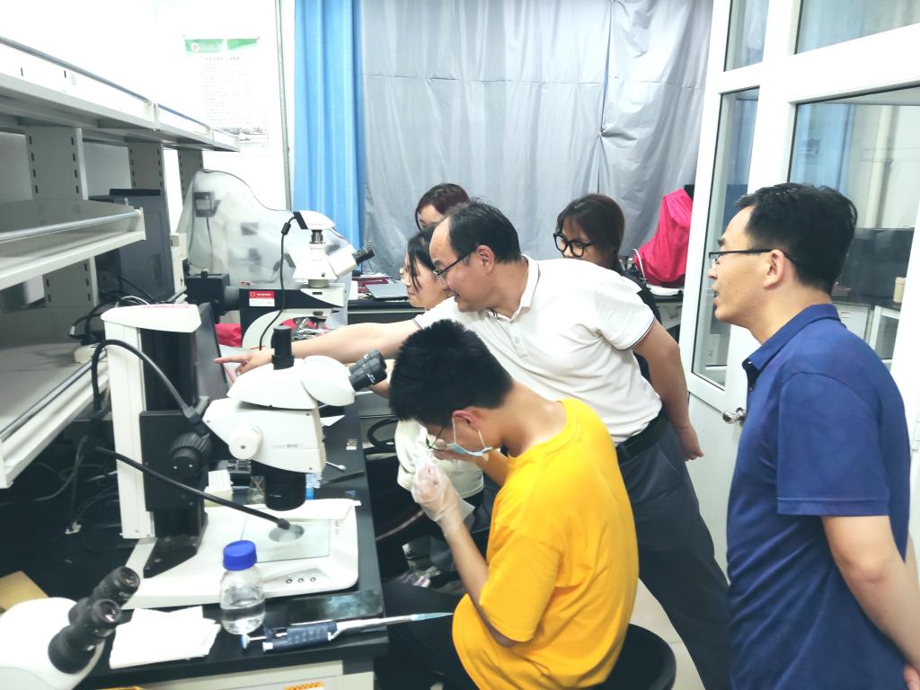 座谈会后,张海龙、崔大勇、朱广伟一行又来到实验室进行现场调研,与正在进行大学生创新创业训练的学生进行亲切交流。