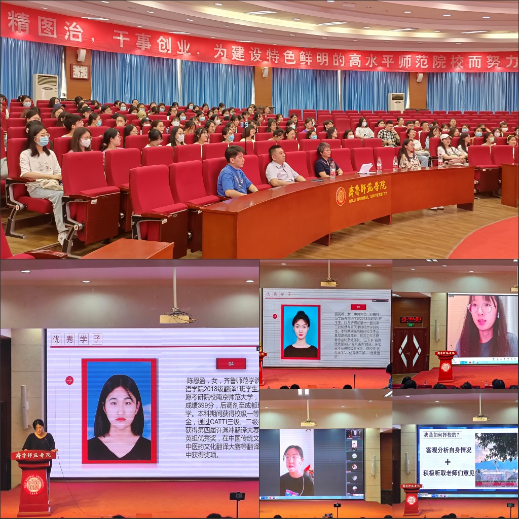 6月8日下午,外国语学院在章丘校区学术报告厅召开2022届考研总结分享会暨2023届考研动员会,外国语学院党委书记于江、院长宋秀葵、党委副书记栾毅之、团总支全体成员以及相关班级班主任出席会议,2019、2020级本科生、2021级专升本全体学生通过线上和线下方式参加会议,会议由栾毅之主持。