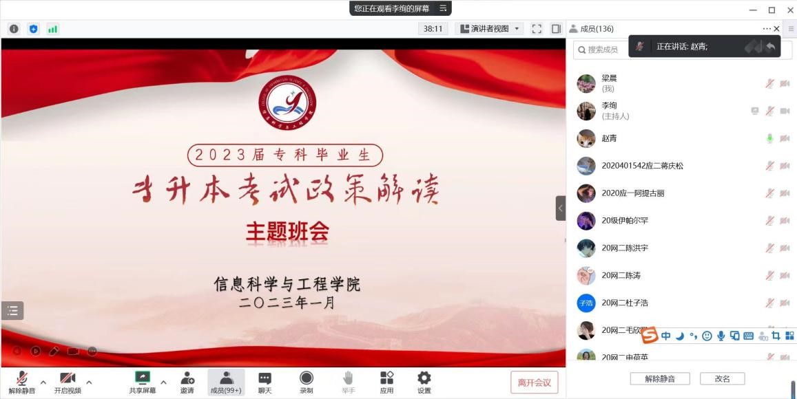 为帮助专升本学子充分掌握考试政策信息,激励学生斗志、增强考生信心,确保考生做好考前冲刺,1月7日上午,信息科学与工程学院以腾讯会议的方式举行了2023届专科毕业生专升本考试政策解读主题班会暨冲刺动员会。信息科学与工程学院党委书记赵青、副书记梁晨及全体2023届专科毕业生参加,团总支书记李绚主持会议。