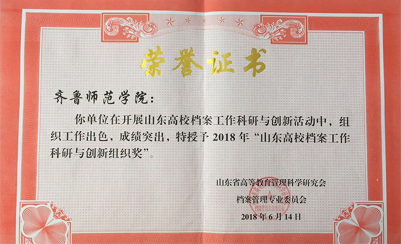 档案馆荣获“山东高校档案工作科研与创新组织奖”