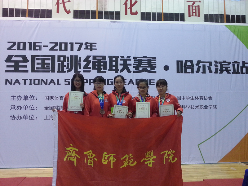 2017年3月25日-26日,2016-2017年全国跳绳联赛在哈尔滨举行。本次比赛由国家体育总局社会体育指导中心、中国大学生体育协会、中国中学生体育协会、全国跳绳运动推广中心、黑龙江省体育总会、黑龙江省社会体育指导中心、哈尔滨科学技术职业学院主办,是国内唯一由国家体育总局社会体育指导中心主办的全国性跳绳赛事。来自全国各地的40支队伍,包括吉林大学、北京建筑大学、大连大学、沈阳体育学院、鞍山师范学院、南京工程技术学院等高校、500多名选手参赛。在校领导的关心下,在教务处和体育学院的大力支持下,金年会官网派出5名队员参赛,参赛运动员通过赛前刻苦训练,比赛时超水平发挥,在参加的6个项目比赛中,获得3个第一名、3个第二名、1个第三名。