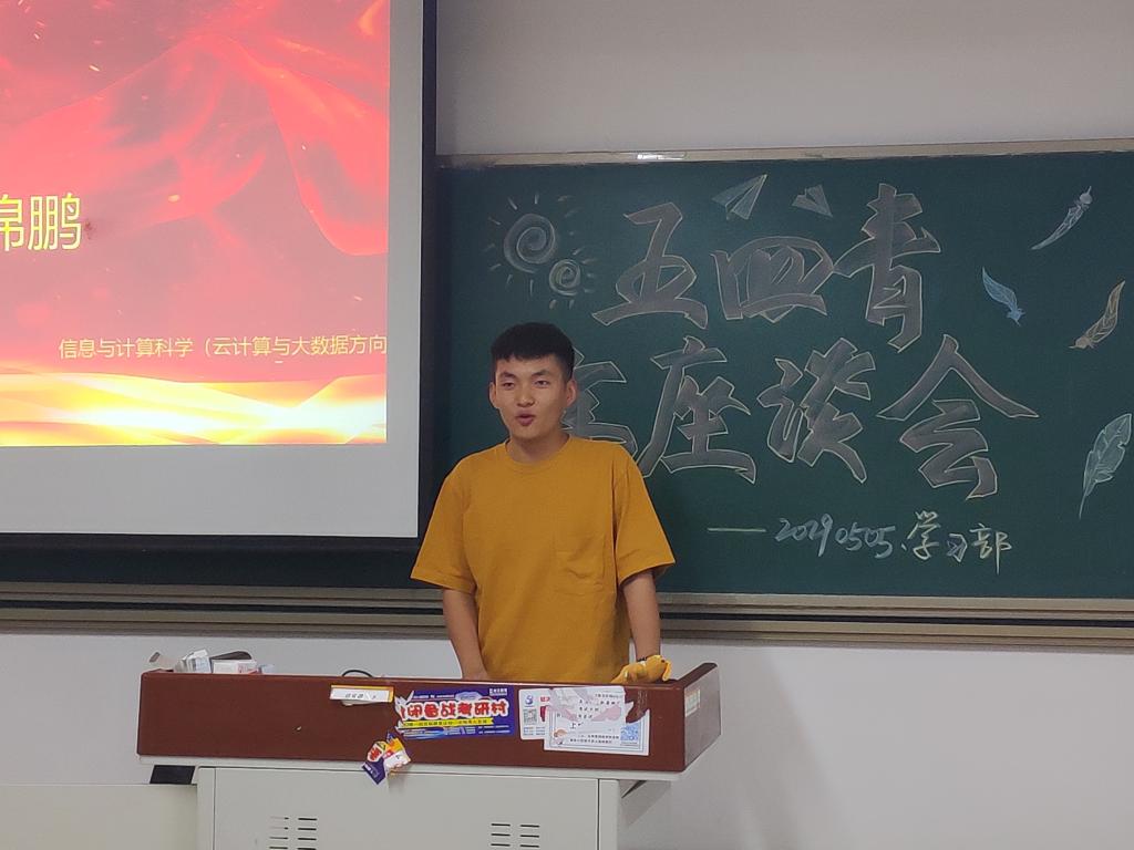 为弘扬五四精神,彰显当代青年积极向上的精神风貌,活跃学院文化氛围,进一步增强青年学子的凝聚力和向心力,5月5日晚7点,由数学学院学习部举办的五四青年座谈会在二号教学楼A410教室拉开帷幕,参加会议的是2018级全体学生。