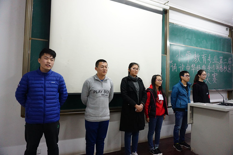 为培养学生阅读经典古诗文的兴趣,夯实小学教育专业学生的专业基础知识,教师教育学院于2017年11月16日下午在一号教学楼A111教室举办了以“诵读中华经典,营造书香校园”为主题的小学教育专业第二届挑战古诗词大赛。本次大赛由王维教授主持,刘文华教授、姚国教授、滕秀芹副教授和孙岩博士担任评委。2016级小学教育免费师范生全体同学参加比赛。