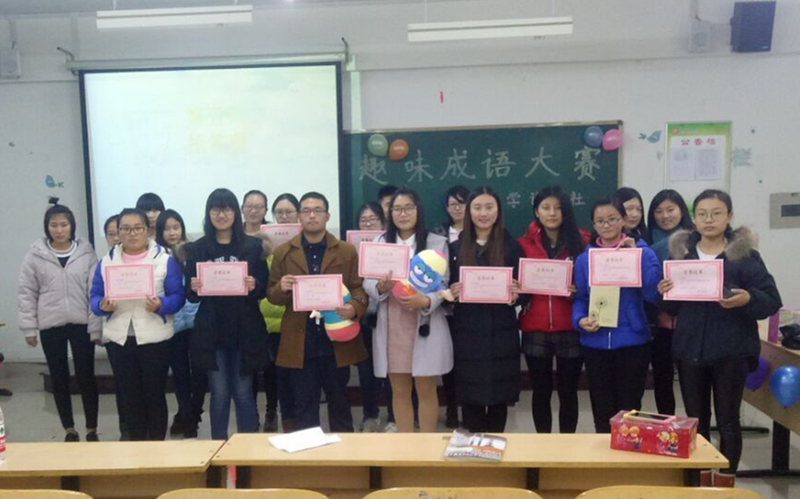 本次趣味成语大赛设置初赛与决赛两个环节。初赛以笔试的形式进行,共选出20位表现出色的选手进入决赛,选手们分别来自教师教育学院、文学院、生命科学学院、数学学院、历史与社会发展学院、外国语学院。决赛以现场答题的形式进行。经过主题词猜题、双音节同词、限时猜题、成语接龙的激烈比拼后,三组选手进入最后的抢答环节,参赛者们争先恐后地回答问题,比赛的热情一浪高过一浪。最后,主持人宣布比赛结果,一等奖获得者是来自历史与社会发展学院的张孟和外国语学院的赵建香同学,二等奖与三等奖分别由教师教育学院与文学院的韩伟、马晓燕等八名同学获得。随后由社长为获奖同学颁奖,主持人致结束词并拍照留念,趣味成语大赛顺利结束。