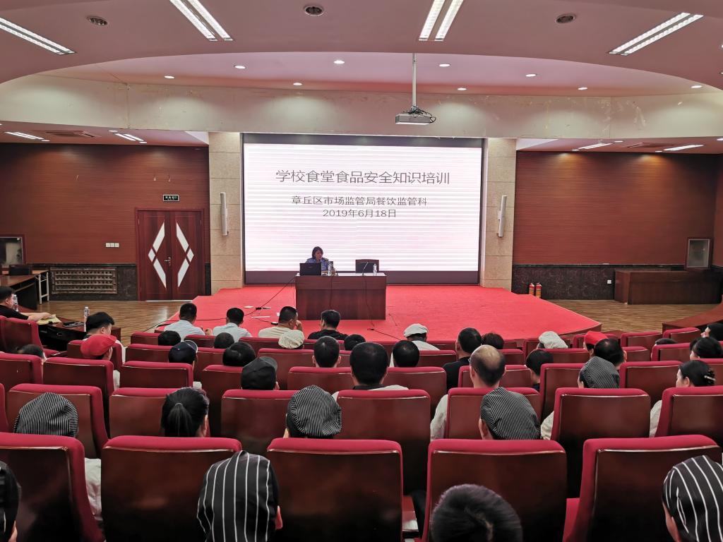 为进一步增强食品经营者食品安全法法律法规的意识,提高食品经营、加工等操作规范水平,保障校内食品的安全,6月18日下午,金年会官网邀请了章丘区市场监管局餐饮监管科周刚科长、张雪清科长对金年会官网餐饮从业人员进行食品安全培训。餐饮服务管理中心全体管理员及食堂从业人员150余人参加。