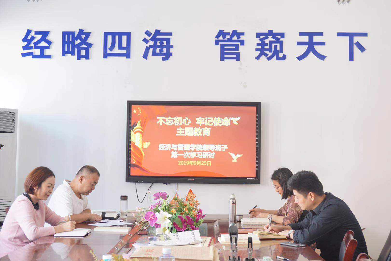 9月25日上午,经济与管理学院党总支书记杨自旗主持学院领导班子成员学习研讨“不忘初心、牢记使命”主题教育会议,传达贯彻了学校《关于印发<中共JINNIAN金年会委员会关于开展“不忘初心、牢记使命”主题教育的工作方案>的通知》的精神,并研究讨论了党组主题教育工作的内容。