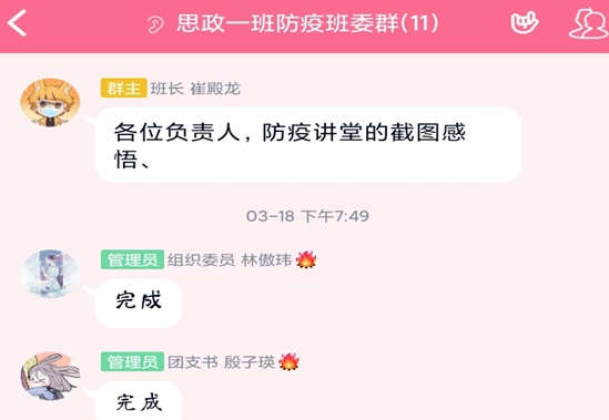同期,学院充分利用新媒体技术优势,通过微信公众号、qq群、微信群等途径动员学生按时收看“疫情防控特别节目”,并上交截图与感悟。这一系列活动的开展有利于增强学生的防范意识,增强班干部的责任感,增强班委会的凝聚力,增强班集体的整体意识,利于开学后疫情防控工作的进一步实施。