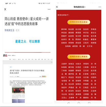 学院依托学生新媒体微信公众号“物电微生活”,对志愿服务同学进行了专题宣传,多篇推文中,均可见志愿者们身处战“疫”一线的身影与他们的志愿服务故事。