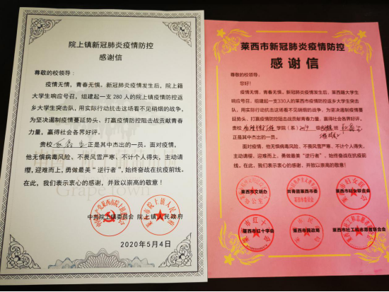 9日上午,物理与电子工程学院收到莱西市人民政府、莱西市院上镇人民政府发来的感谢信,信中对学院学子耿鑫生积极参与疫情防控志愿服务工作一事给与充分肯定,称赞其为“迎难而上的最美‘逆行者’”。