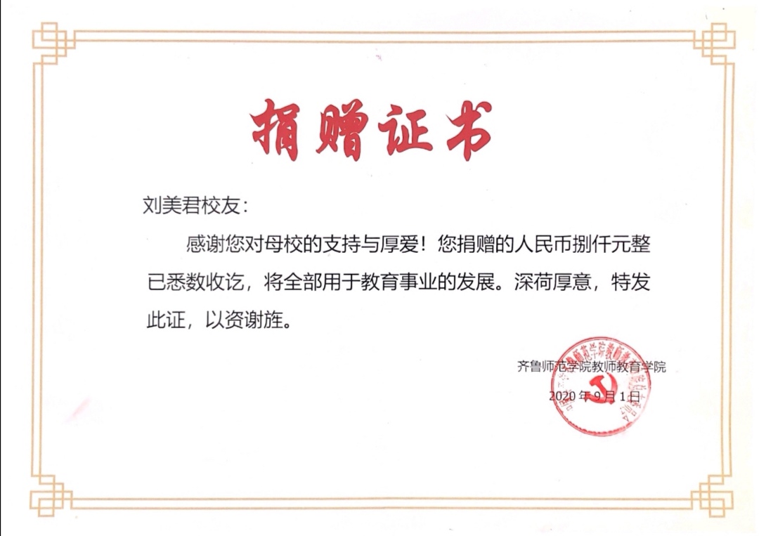 刘美君校友自大三起就萌发了捐赠国家奖学金的想法,如今付诸于实际,希望这笔钱能帮助到更多需要帮助的同学。刘美君认为自己只是普通学子中的一员,她感谢学院对自己的培养,感谢老师们对自己四年来的谆谆教诲,她说无论身在何处,都要做一个充满爱心和有责任心的人;不辜负母校的重托和期待,努力为母校增光添彩。刘美君校友已被东北师范大学录取为教育学原理专业全日制硕士研究生,即将开始新的求学之路。