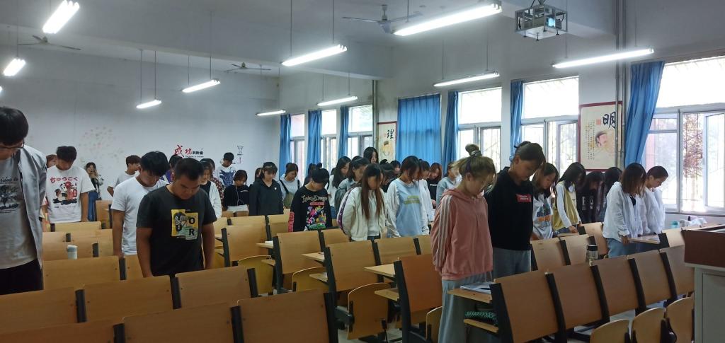 会议由各班团支书主持,通过还原“九一八事变”的本来面貌,重现“东亚病夫”“华人与狗不得入内”那些沉重而痛苦的回忆,由此引出“吾辈当自强”的理念。在当今繁盛昌荣的时代下,当今青年学生更应该铭记历史,牢记使命。九一八的警报是穿越时空的警报,时刻提醒当今青年学生自强不息,努力奋斗。随后,19级全体同学起立,怀着沉痛的心情进行默哀,让我们静静的追思、深深地缅怀,把最深情的祝福和最崇高的敬意,送给保卫我们祖国的英雄们!