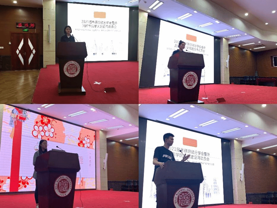 今年成功考研的六位学生分享各自经验。邱泽静同学以综合成绩第一的成绩由山东师范大学英语语言文学专业录取的,向大家分享了自己的择校经历、第二外语考试科目备考与复习教材选择的学习经验;张安洲同学由青岛科技大学英语语言文学专业录取,她用亲身经历讲述自己作为大学二年级转专业的学生,在专业课学习以及日语备考的方法,提醒大家要学会调整心态,戒骄戒躁;李颖建同学由天津科技大学英语语言文学专业录取,从报考择校与复试调剂学校两方面强调了选择研究生学校的重要性,认为大家在报考时,不要拘泥于名校效应或者经济较为发达地区,要放宽眼界、认真听取学院教师给予的报考建议,在结合自身能力基础上选择适合自己专业水平的研究生学校;黄福康同学由哈尔滨师范大学学科英语专业录取,讲述了如何有针对性地选择学校和专业,也分享各科备考经验;王保荣同学由厦门理工学院电影市场营销专业录取,向大家具体介绍了如何在跨专业考研中取得成功,也分享了获取考研信息的网络资源,期待大家一战成硕;孟令熙同学由英国伯明翰大学TESOL专业录取,讲解了国内考研与申请国外研究生的区别,以及申请国外研究生所需基本材料——大学成绩单、在校生证明、雅思或托福成绩、推荐信、个人简历等。
