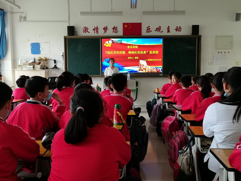 歌曲赏析、历史介绍、现场演奏、同声歌唱……5月21日,音乐学院“追忆百年历程 唱响红色经典”宣讲团走进章丘东山小学,开展主题宣讲活动。