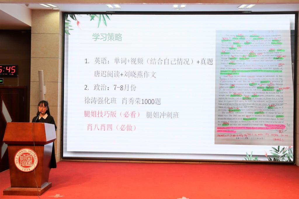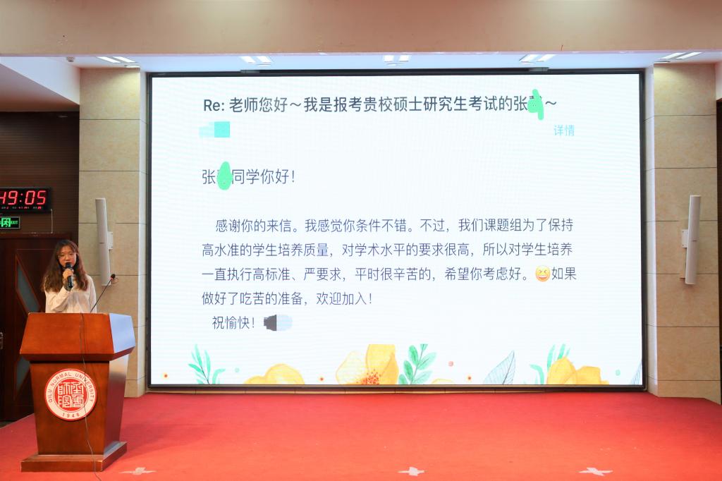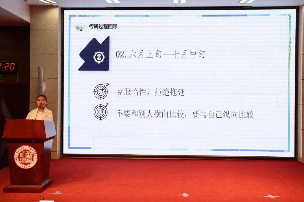 李晓晓围绕“好的开始是成功的一半”,讲述了自己的考研规划。从最初明确考研目标学校,再至根据不同学习阶段的特点制定相应的学习策略,以及日常中对学习内容进行合理的时间安排,她毫无保留地将考研备考“干货”分享给学弟学妹们。