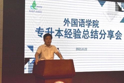 6月22日晚,外国语学院于学术报告厅召开2021届专升本经验总结分享会,外国语学院院长宋秀葵,党总支书记贾国斌,党总支副书记郁志营,团总支、商务英语教研室全体教师及2019、2020级班主任出席本次会议。此次会议由团总支书记牛荦主持,2018级商务英语专升本成功学生代表、2019级2020级商务英语(专科)专业全体学生参加会议。