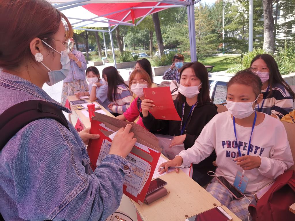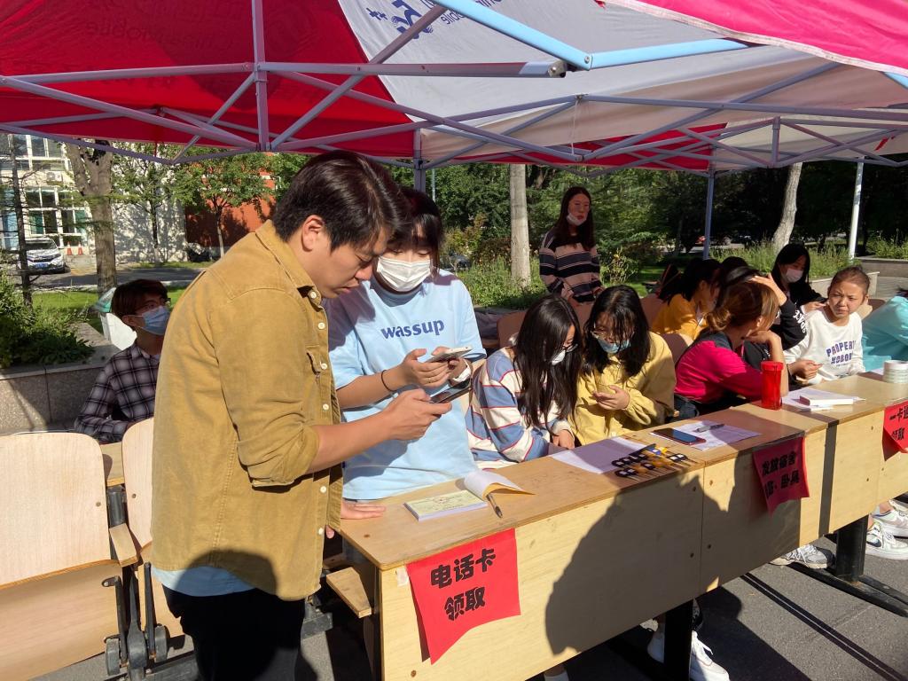省外新生抵达报到地点后,在学生会成员指导下依次进行扫脸报到、测量体温、上交准考证和录取通知书、领取校园一卡通和宿舍钥匙及用品、办理校园网等报到流程。