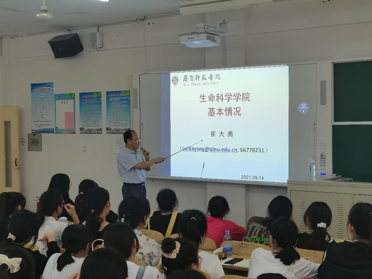 9月14日10:20、15:30,在1号教学楼A307教室,生命科学学院副院长崔大勇教授秉承“广泛学习、追求真知、探索真理、提高修养”的育人精神,分两场为2021级全体新生开展了别开生面的专业导论讲座,为新生掀开生命科学学院的魅力一角。崔大勇教授首先简要介绍了生命科学学院的基本情况,包括组织框架、党政机构、师资队伍、教学实验室等。随后他分别从发展历程、研究方向、建设目标、研究团队、研究平台、研究成果和学生培养等方面,详细介绍了“山东省能源植物种质创新与改良实验室”、“济南市园林植物分子育种工程实验室”和“JINNIAN金年会动物应激与疾病重点实验室”,让新生了解了生命科学学院强大的师资力量、一流的科研创新平台以及独具特色优势的基于本专科学生的科研创新培养体系。最后,他鼓励486名2021级新生充分利用好这些有利条件,在生命科学学院启程逐梦,与未来相拥。