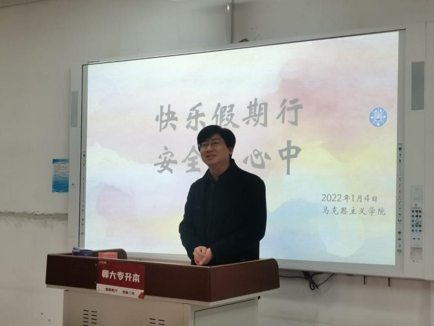 期末考试、寒假和征兵季将至,为帮助马克思主义学院全体学生做到诚信参考,增强假期安全意识和国防意识,2022年1月4日,马克思主义学院于二号教学楼A207教室召开了全体学生大会。参加本次大会的有马克思主义学院党总支书记贾龙、团总支副书记王雅文以及马克思主义学院全体学生。