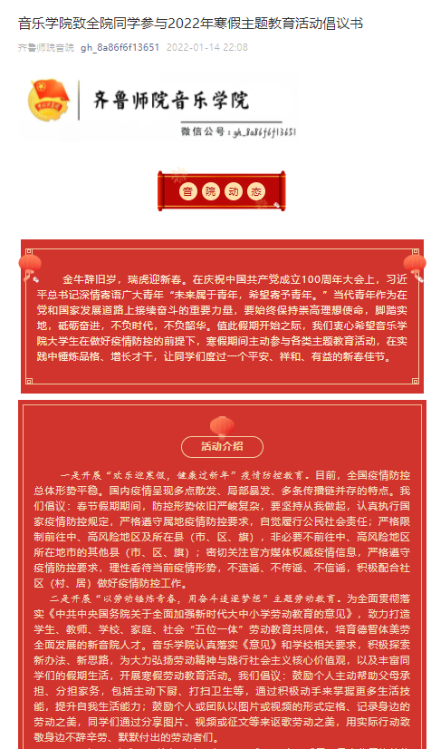 “一份特别的寒假作业” ——音乐学院2022年寒假主题教育活动倡议书