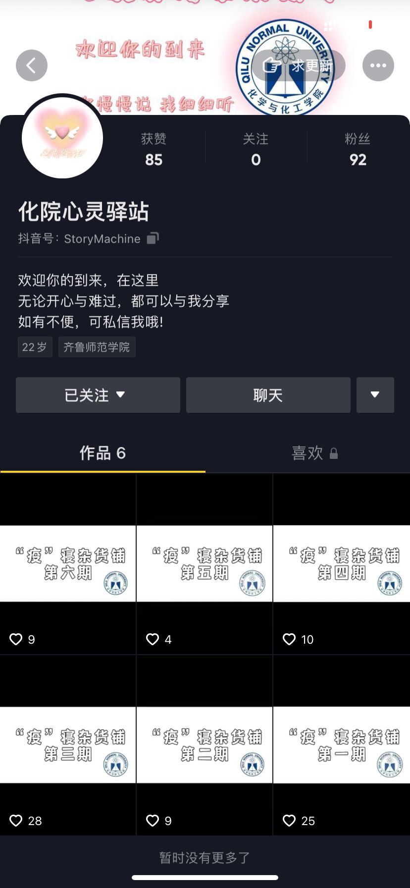 据了解,抖音是一款日均视频播放量过亿、日活跃用户数量已在数百万量级的音乐创意短视频社交软件,深受同学们的喜爱,正如抖音“记录美好生活”的品牌定位,化学与化工学院“化院心灵驿站”创作内容以身边的真实故事和体验为素材,以振奋人心、鼓舞士气为主旋律,将心理故事和体验制作成音频、视频等形式,与大家分享积极健康的心灵感悟,弘扬正能量,传达积极向上的学院文化,打造内涵丰富的新媒体账号。
