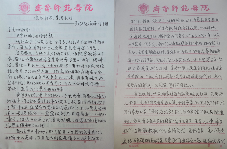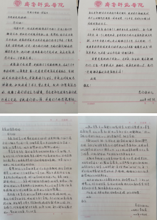 一封封家书寄托着同学们满满的思念,一字一句都在向家长表达着自己对校对家的感情,字里行间表达着自己对党对国的感恩,表达着自己战疫过程中的成长,表达着身为党员的自豪和担当。从“党员突击队”的鲜艳旗帜写到坚守“疫线”的志愿者们,从防护服下辛苦的医务工作者写到在学校连夜值班的辅导员老师,从同学间的相互关爱写到坚守岗位的餐厅的叔叔阿姨们,一笔一划都在让家长安心放心。