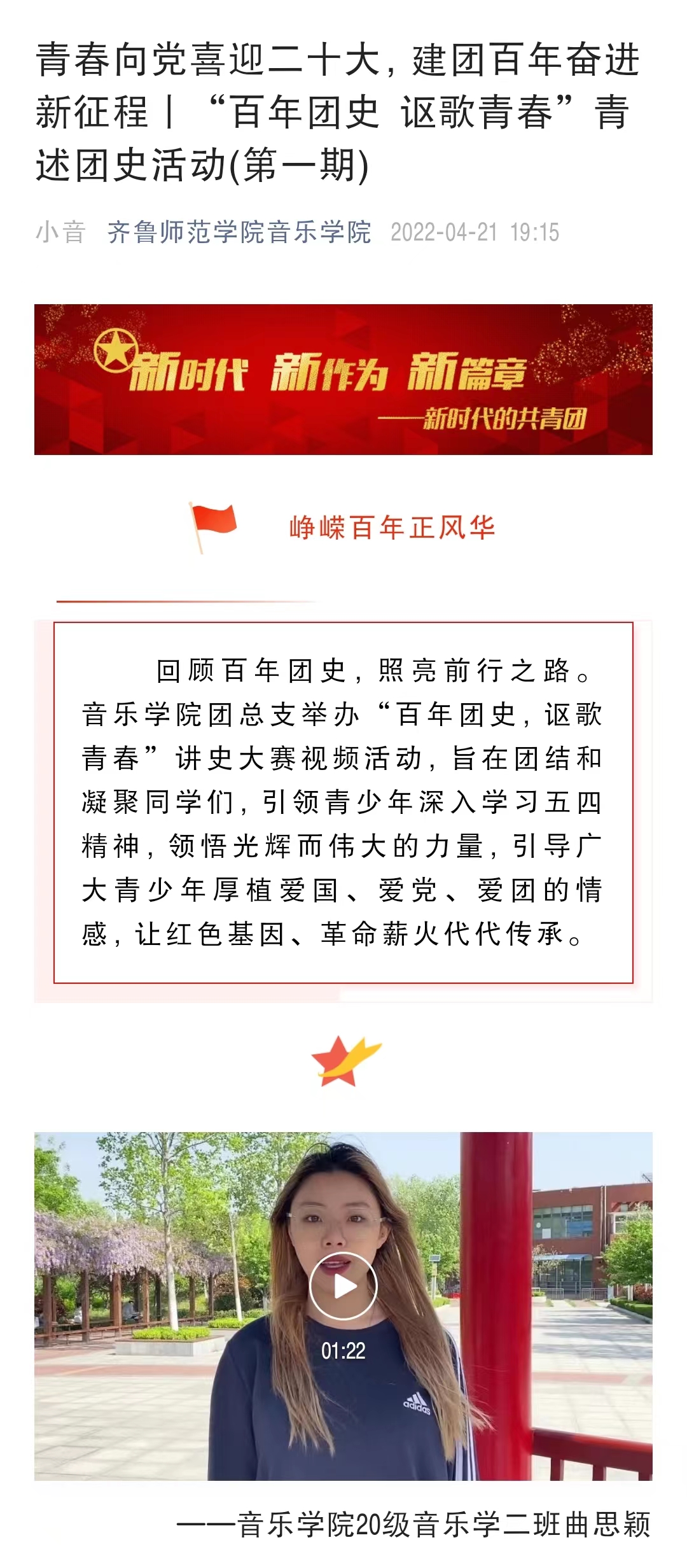为深入学习贯彻习近平新时代中国特色社会主义思想,引导广大团员青年继承和发扬“五四”运动的光荣传统,展现青年学生奋发有为的良好精神风貌和青春风采,以实际行动献礼共青团建团100周年,音乐学院团总支以“听、宣、述、建、竞、致”为重点,开展“青春向党喜迎二十大,建团百年奋进新征程”系列主题教育活动。