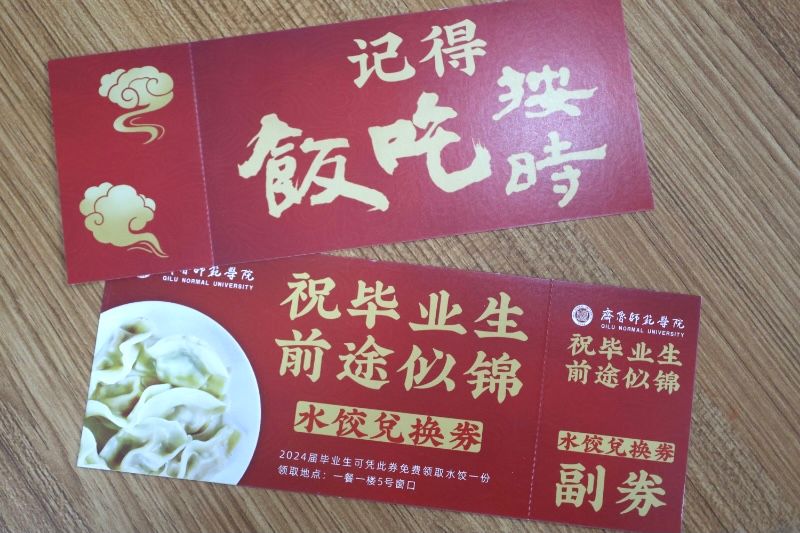 水饺兑换券,在设计上有很多巧思。兑换券分为正券和副券两部分,兑换水饺后学生可保留副券,留作毕业纪念。兑换券在设计上加入了“记得好好吃饭”“祝毕业生前途似锦”等温馨的祝福话语,希望可以带给毕业生别样的温情和祝愿。“没想到离别时能吃到学校赠送的水饺,感动满满。”教师教育学院毕业生王耀民激动地表示,未来,每每想起这一碗热腾腾的水饺,都会觉得充满动力,自己一定要带着这份母校的深情厚谊走好人生奋发之路。