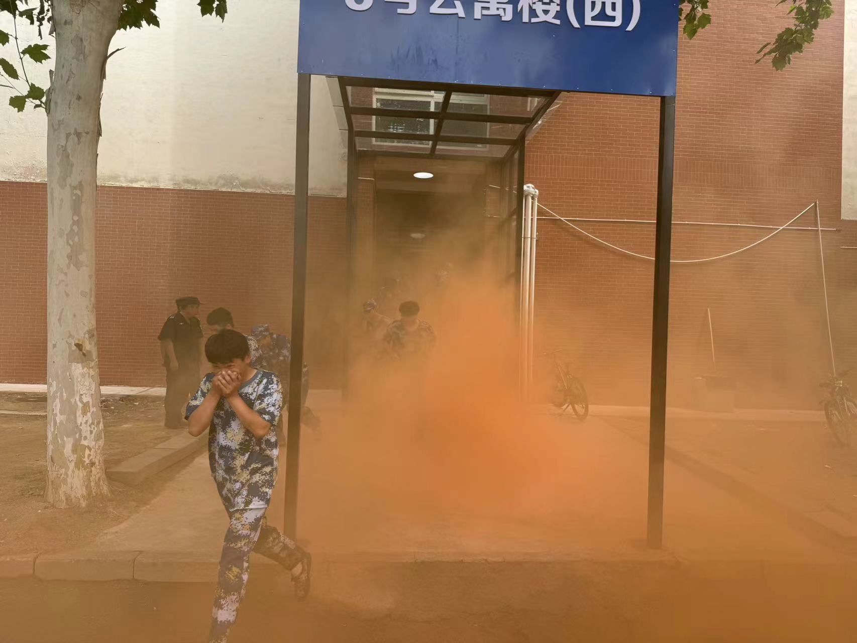 在“起火了!”的呼喊声中,一阵“浓烟”从学生宿舍楼冒出,伴随着警报声响起,同学们迅速进入紧急状态。在老师和楼管的指导下,同学们用湿毛巾捂住口鼻,弯腰低姿,按照预定疏散路径迅速有序地逃离宿舍楼。楼内疏散人员按照预先的消防演习方案疏散学生,保障楼内学生的安全,以免慌乱中出现拥挤或者踩伤现象。